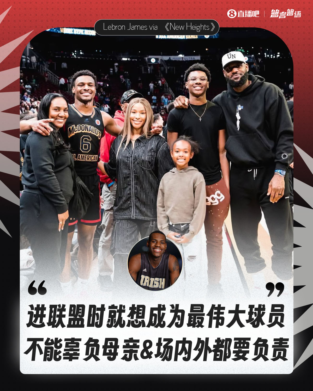 在被问到刚满18岁的他是如何应对外界对他的超高期望时,詹姆斯说道:“我知道我来自何处。我来自阿克伦、克利夫兰、俄亥俄州东北部,当我知道我是那10亿个人之中仅有的那1个、2个、3个时。如果你得到机会,你不能搞砸它。