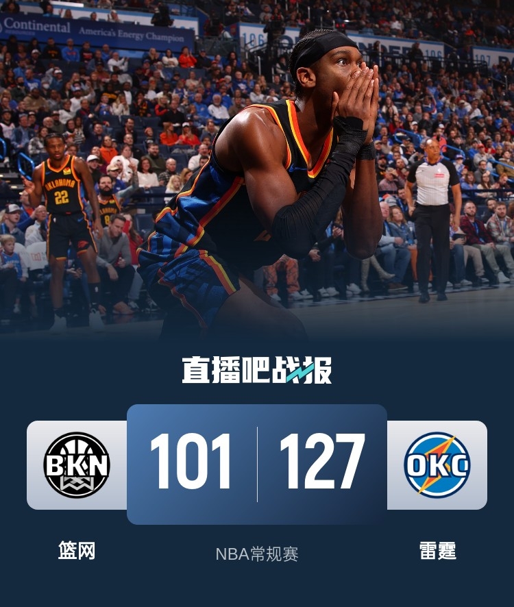 一开场,雷霆攻防两端占据绝对优势,以赛亚-乔独中4记三分,雷霆单节轰下9记三分以39-19领先20分结束首节,第二节,篮网进攻回暖,双方围绕20分的分差展开拉锯战,篮网不断冲击篮筐,雷霆多点开花给出回应,半场战罢雷霆69-49领先篮网。下半场,篮网持续反击缩小分差,亚历山大得分助攻一肩挑稳住局势,末节雷霆一波10-4继续扩大领先,双方换下主力阵容耗完垃圾时间。最终,雷霆127-101轻取篮网,主场过关。