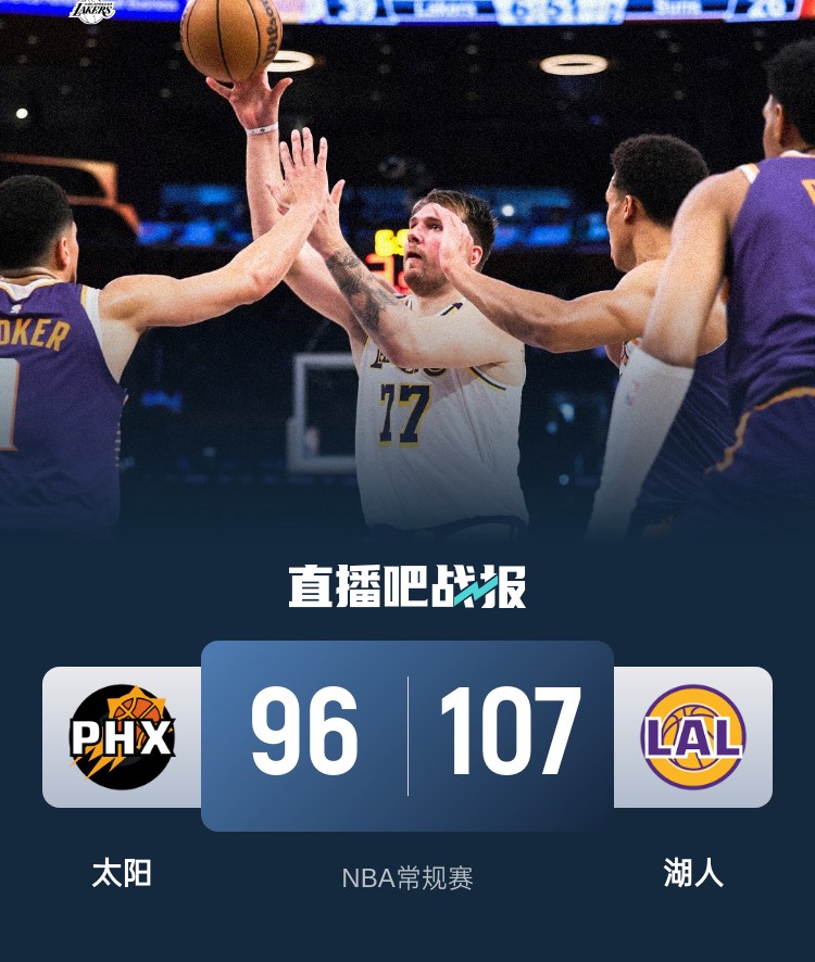 比赛开始,湖人上来打出7-0不错开局,太阳迅速回应9-1反超,随后东契奇连续外线发炮带队建立主动权,文森特三分再中一度拉开20分领先,次节双方展开拉锯战,太阳三巨头状态不佳,外线颗粒无收,里夫斯接连中远投命中,海斯继续吃饼,半场湖人还领先17分。下半场,比尔因腿筋伤退,杜兰特连续中远投砍下8分带队一度追到个位数分差,东契奇又是送妙传止血后连续杀伤内线稳住领先优势,三节湖人还领先12分,末节双方命中率都有下降,里夫斯3+1后东契奇再打2+1帮助湖人牢牢守住双位数领先,最终湖人107-96击退太阳,终止4连败。