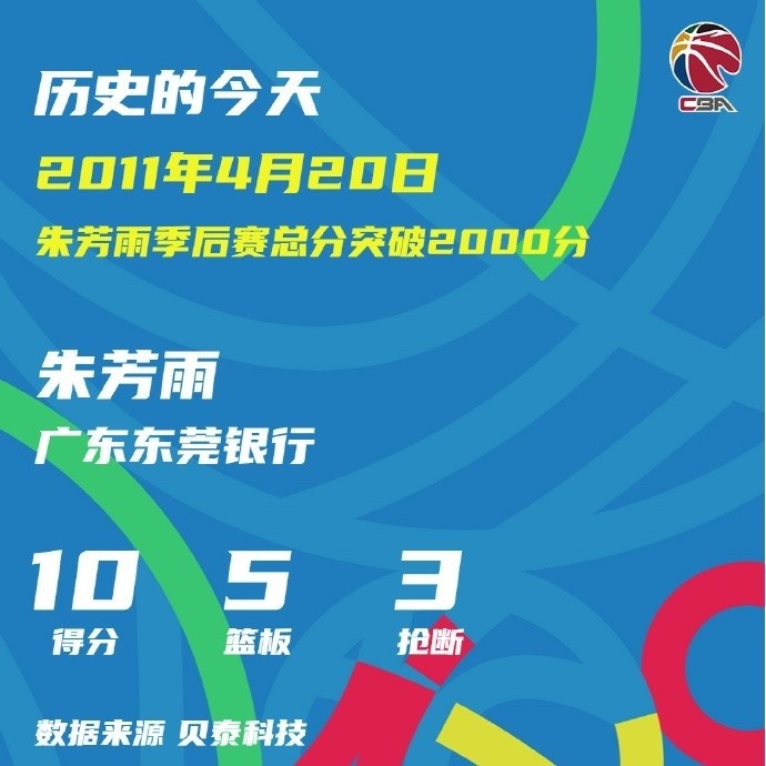 2011年4月20日,2010-2011赛季CBA联赛季后赛总决赛第3场,广东东莞银行85-118不敌新疆广汇汽车。该场对决,朱芳雨出场时间超过35分钟,全场10投4中,其中三分球7投2中,得到10分5篮板3抢断。此役战罢,朱芳雨CBA联赛季后赛生涯总得分就此达到2001分,成为史上第三位季后赛总得分突破2000分的球员。