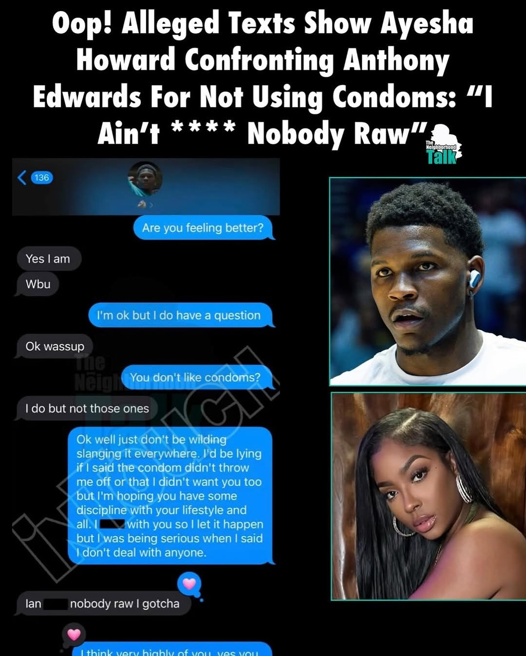 Ayesha Howard晒出了与华子的短信截图,力证是华子不想戴套,而Ayesha Howard自己还劝华子不要那么野,生活要自律一些。