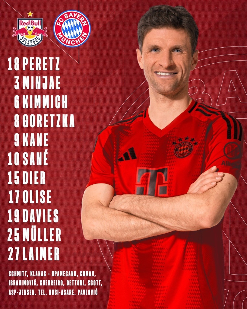 拜仁替补:35-施密特、48-克拉纳克、2-于帕梅卡诺、11-科曼、20-阿尔扬-伊布拉希莫维奇、22-格雷罗、39-特尔、41-库西-阿萨雷、45-帕夫洛维奇、46-阿斯普-延森、98-斯科特、99-德托尼