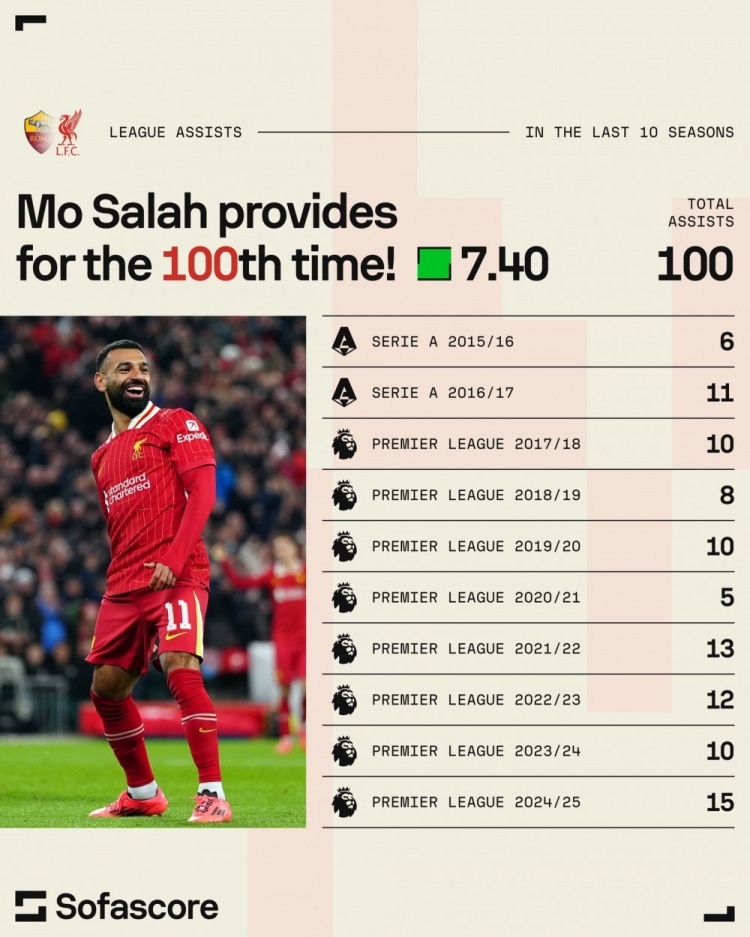 此外,在近10个赛季中,萨拉赫在联赛中的助攻总数已经达到了100次,他是五大联赛中第四位做到这一点的球员。此前三位分别是德布劳内(117助攻)、穆勒(116助攻)和梅西(110助攻)。