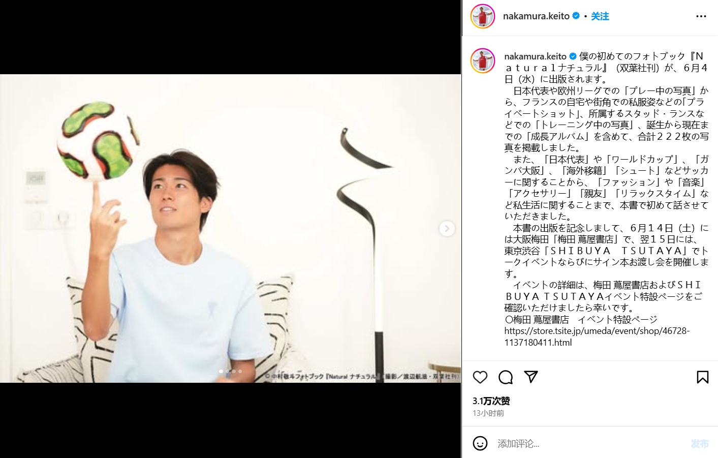 04月24日讯 兰斯前锋中村敬斗在社媒发文,宣布包含自己球场内外生活的写真集将于6月4日正式发售。