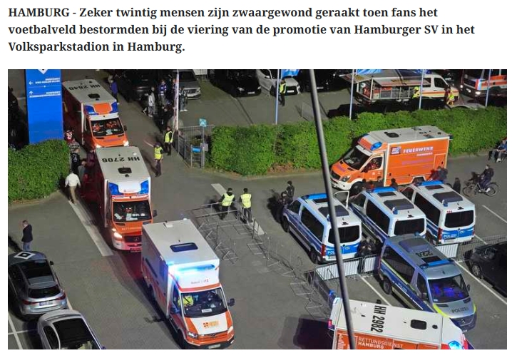 05月11日讯 德乙第33轮,汉堡6-1大胜乌尔姆,提前一轮锁定升入德甲。比赛结束的哨响后,汉堡球迷涌入场内疯狂庆祝升级。据《图片报》报道,这场狂欢庆祝导致近20人重伤,其中1人生命垂危,球场的部分草皮也被球迷挖走。