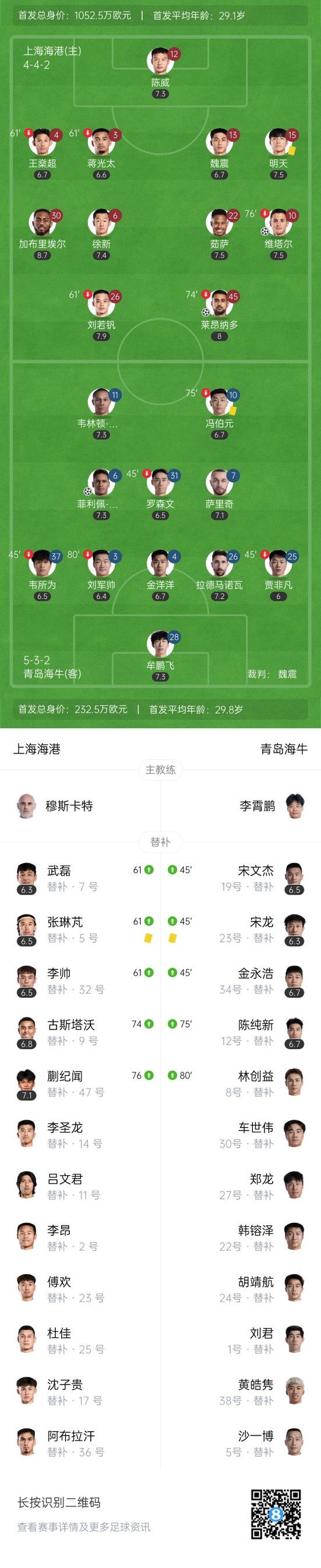 下半场补时5分钟,海港3-1青岛海牛。