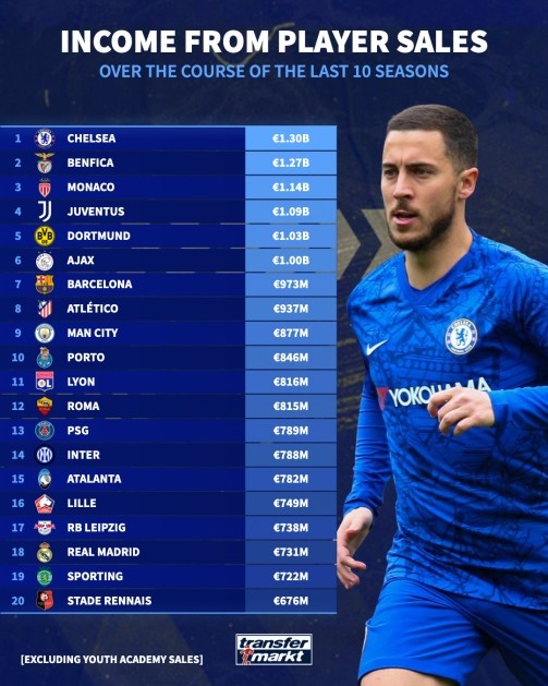 过去10个赛季各俱乐部卖球员收入排行:切尔西13亿欧稳居第一